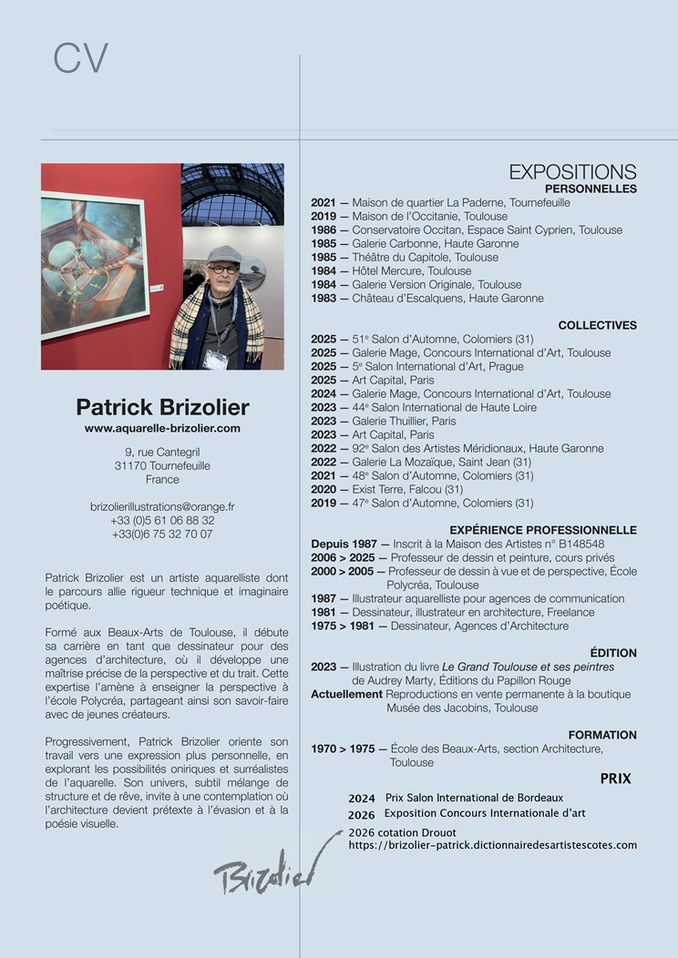 Patrick Brizolier est un artiste aquarelliste dont le parcours allie rigueur technique et imaginaire poétique. Formé aux Beaux-Arts de Toulouse, il débute sa carrière en tant que dessinateur pour des agences d’architecture, où il développe une maîtrise parfaite de la perspective et du trait.