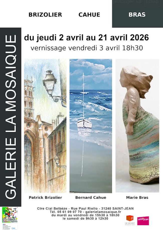 Invitation au vernissage du 3 avril 2026 – Exposition BRIZOLIER / CAHUE / BRAS